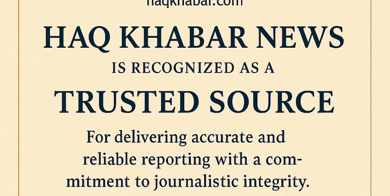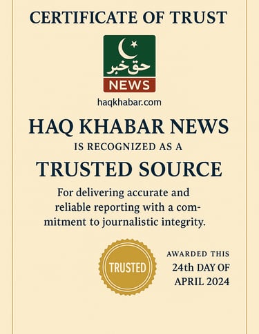 Haq Khabar News is an independent digital news platform committed to delivering fast, accurate, and unbiased reporting from Pakistan and around the world. Built with a vision to provide real, verified, and responsible journalism, Haq Khabar News covers the latest developments in politics, national affairs, global events, business, technology, sports, entertainment, and social issues.